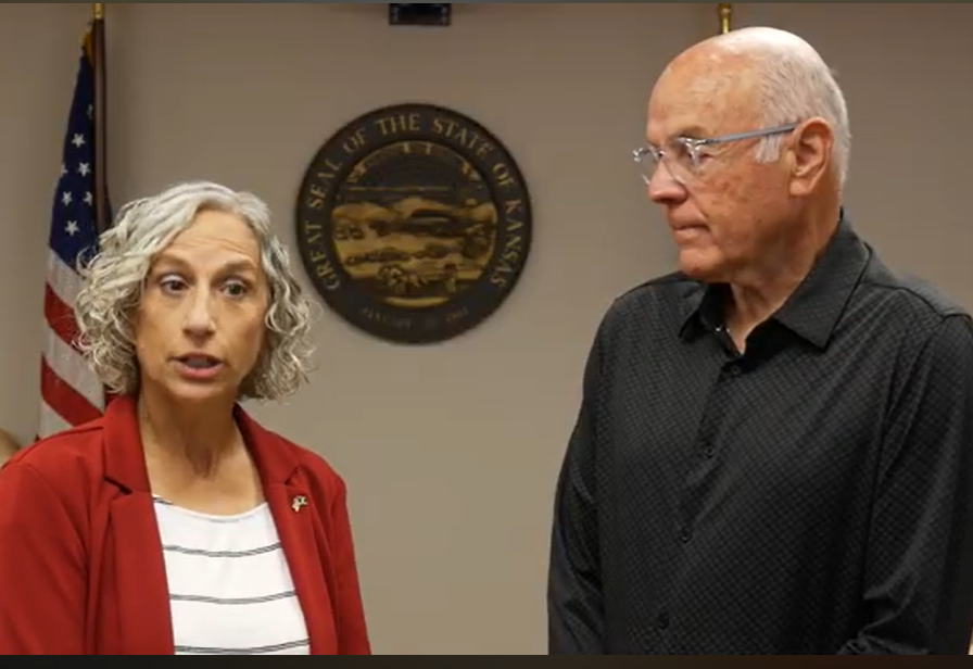 Cathy Hopkins, left, chair of the Kansas State Board of Education, and Danny Zeck, the State Board's vice chair, speak about what they're proud of in Kansas education as part of a video celebrating American Education Week. (YouTube screenshot)