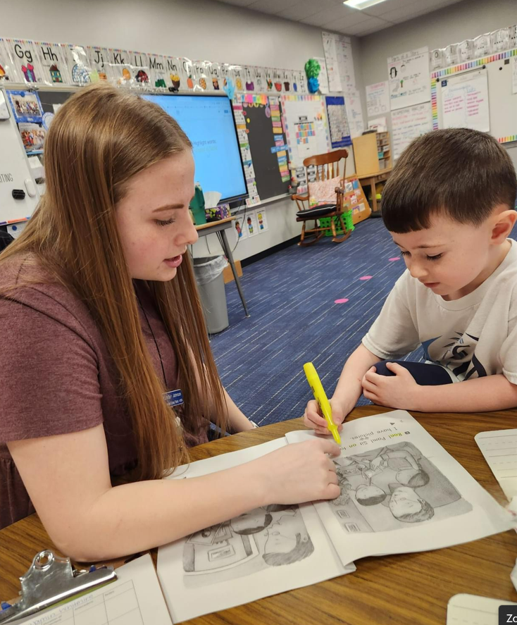 Kamdyn Johnson, a kindergarten teacher at Clearwater West Elementary, Clearwater USD 264, works with one of her students on a decodable text. (Photo submitted by Kamdyn Johnson)