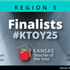 Other Region 3 KTOY semifinalists were Dandra Arter, a library media specialist at Clear Creek Elementary School, De Soto USD 232; Hannah Mastorakos, a first-grade teacher at Welborn Elementary School, Kansas City USD 500; Aaron Batterbee, a science teacher at Gardner Edgerton High School, Gardner Edgerton USD 231; and Daniel Freeman, a band and music theory teacher at Blue Valley High School, Blue Valley USD 229.